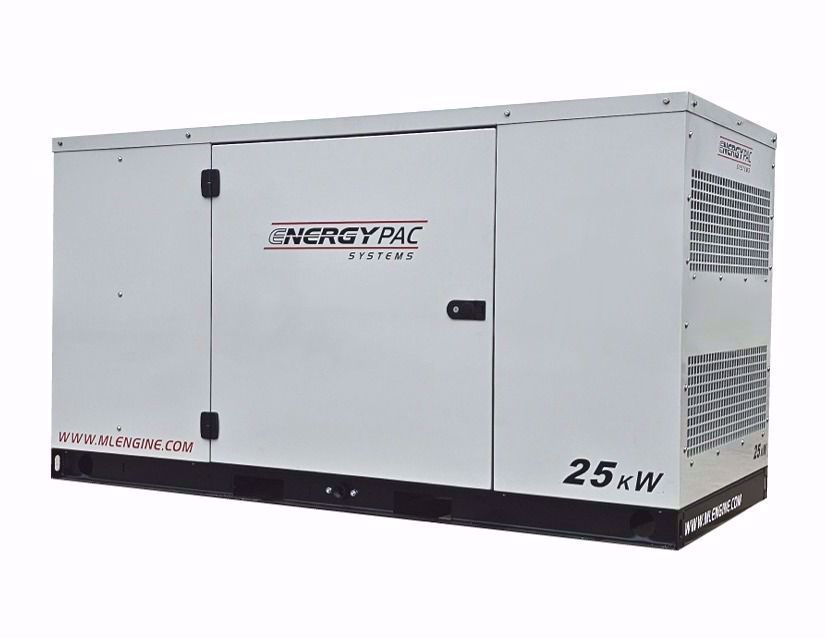 ML25PHRNG-SS-EP - ENERGYPAC SYSTEMS - Stationary Standby Labeled - 25KW Natural Gas/Propane Radiator Cooled 1800rpm Natural Gas/Propane Heavy Duty Generator set with: PSI 2.4L Naturally Asperated Heavy Duty 1800rpm 4 Cylinder NG Engine, EPA Certified Stationary Standby, Heavy Duty Brushless Generator End with Marine Coating & Automatic Voltage Regulator, Oversized Generator End for Full 1 Phase and 3 Phase output, Automatic Start Control Panel with LCD Display (Engine monitoring, Generator Monitoring (Volts/Hertz) , Safety Shutdown System, Vibration Isolators, Radiator, Hoses, Fan Guard, Industrial Air Cleaner, Engine Support Legs, Oil Filter, Welded Steel Skid with Fork Pockets, Silent Sound Attenuated Aluminum Powder Coated Enclosure with Lockable Doors, Battery Charger, Battery, Owner's Manual, and Shop Load Bank Tested.